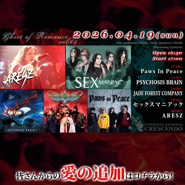 2026/04/19(日) 「Ghost of Romance vol.65」 出演:ARESZ / セックスマニアック / JADE FOREST COMPANY / PSYCHOSIS BRAIN / Paws In Peace 彼らへの「愛の支援」はコチラから! ※当店からお礼状が届きます! ※お礼状は (ご支援が何口分であっても) 1回の決済につき1アーティスト1枚です!