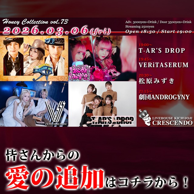 2026/03/6(金) 「Honey Collection vol.73」 出演:劇団ANDROGYNY / 松原みずき / VERiTASERUM / T-AR'S DROP 彼らへの「愛の支援」はコチラから! ※当店からお礼状が届きます! ※お礼状は (ご支援が何口分であっても) 1回の決済につき1アーティスト1枚です!
