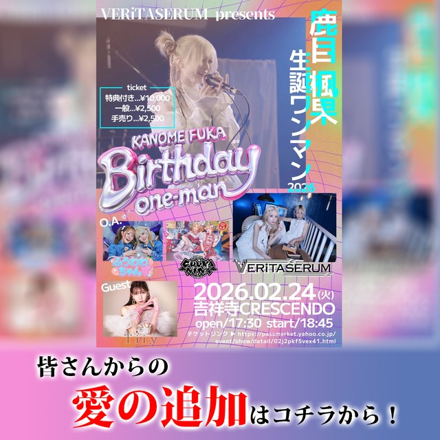 2026/02/24(火) 「VERiTASERUM presetns 鹿目楓果 生誕ワンマン2026」 出演:VERiTASERUM / CHUKA NINA / ふうわわちゃんズ / Tiiy(Guest) 彼らへの「愛の支援」はコチラから! ※当店からお礼状が届きます! ※お礼状は (ご支援が何口分であっても) 1回の決済につき1アーティスト1枚です!