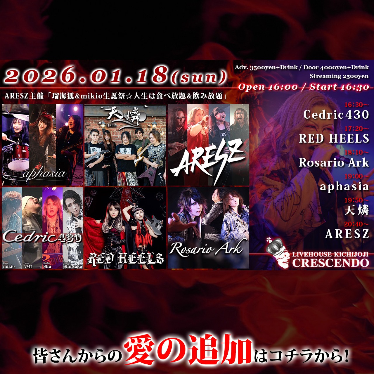 出演:ARESZ(サポートDr.天燐 鉄兵) / 天燐(静岡) / aphasia(サポートBa.ARESZ 雅己) / Rosario Ark(滋賀) / RED HEELS / Cedric430(AMI, Shu, mikio, Shinsaku)