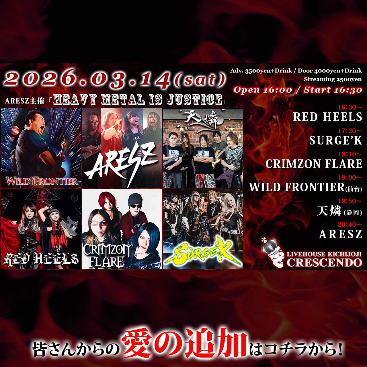 【愛の支援(ポストカード)】ARESZ / 天燐 / WILD FRONTIER / CRIMZON FLARE / SURGE’K / RED HEELS (3/14) | LIVE HOUSE CRESCENDO