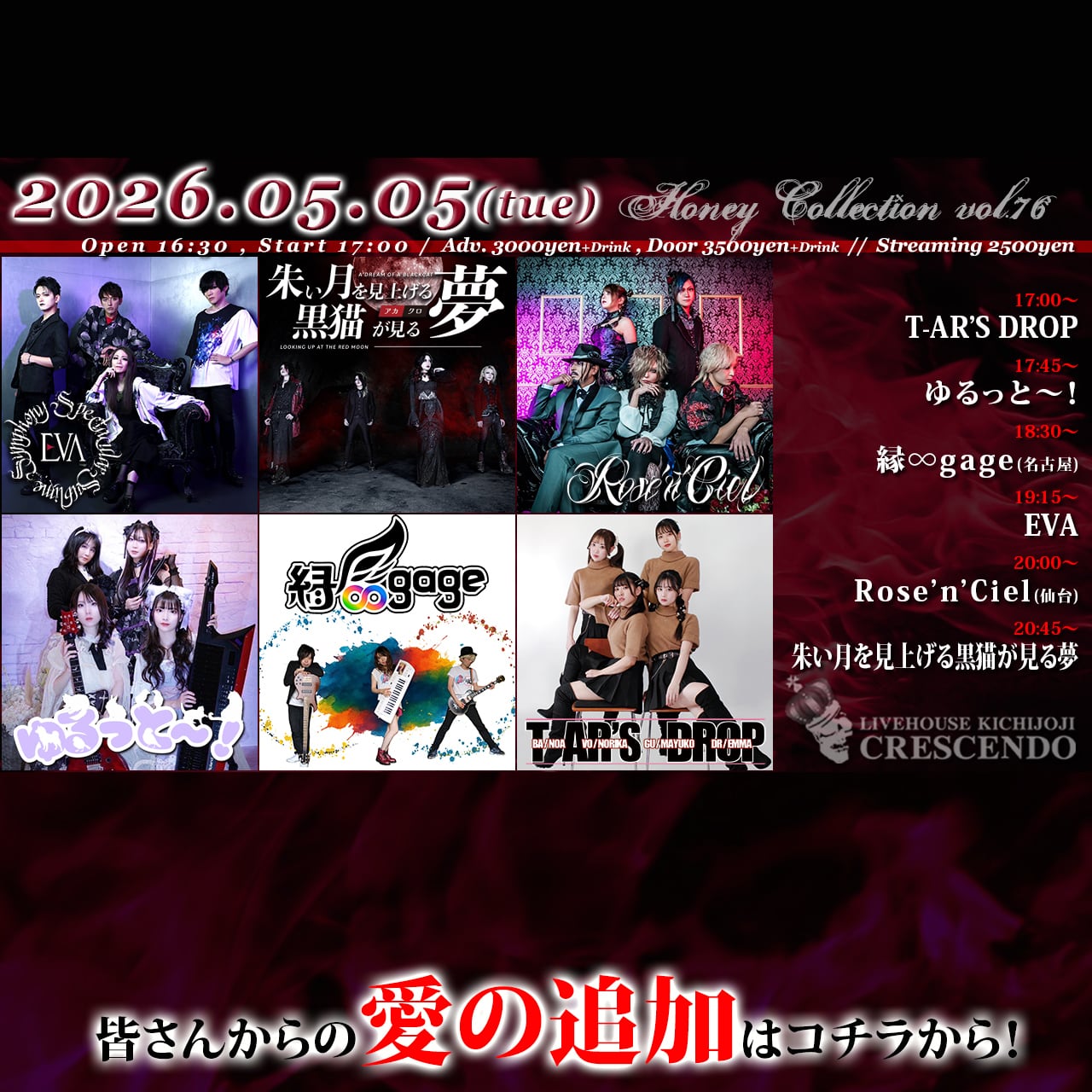 出演:朱い月を見上げる黒猫が見る夢 / Rose'n'Ciel(仙台) / EVA / 縁∞gage(名古屋) / ゆるっと~!/ T-AR'S DROP